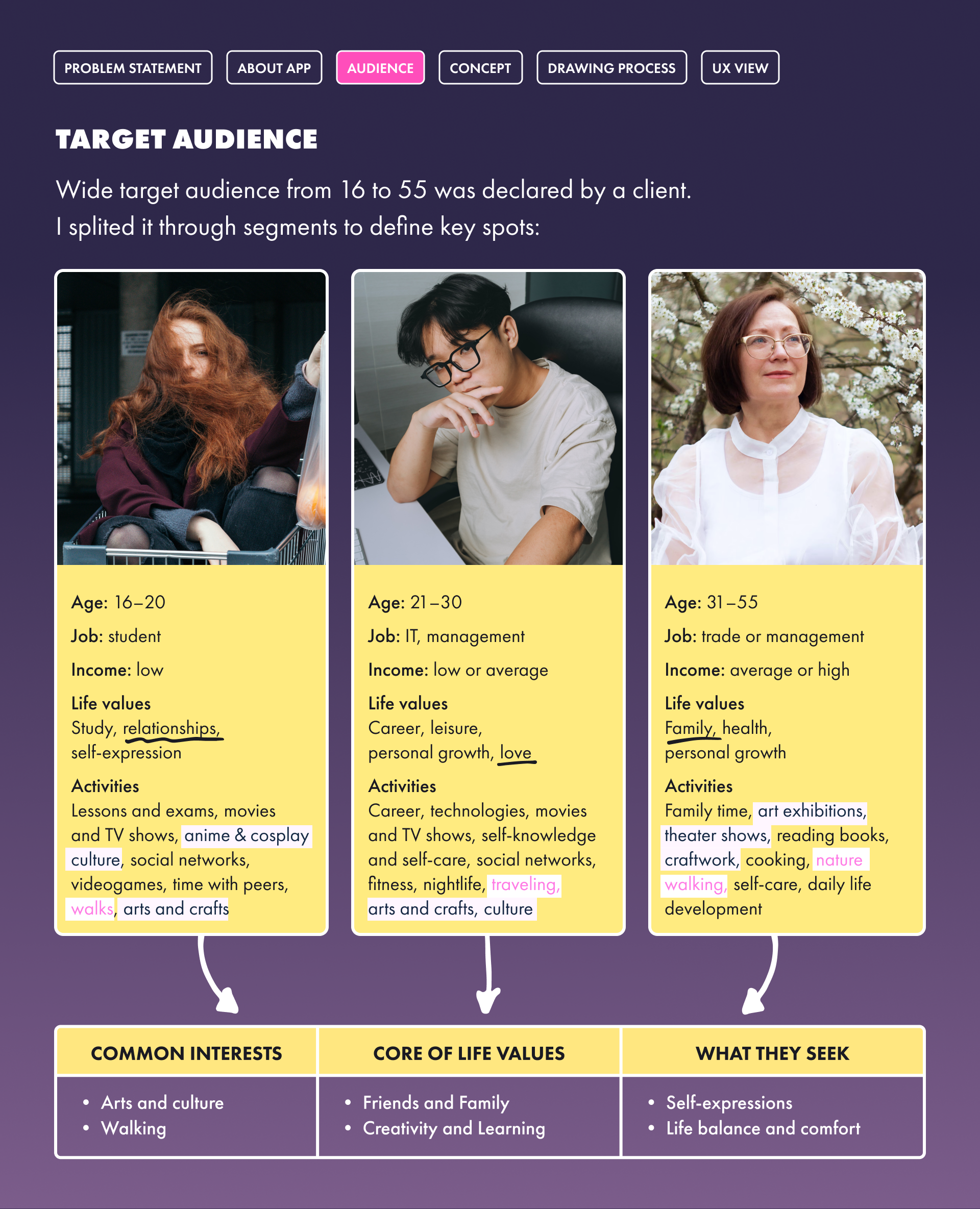 Through an analysis of target audience I learned that core of each segments life revolve around a creativity, knowledges and relationships with loved ones. It is good start for seeking of a design concept.